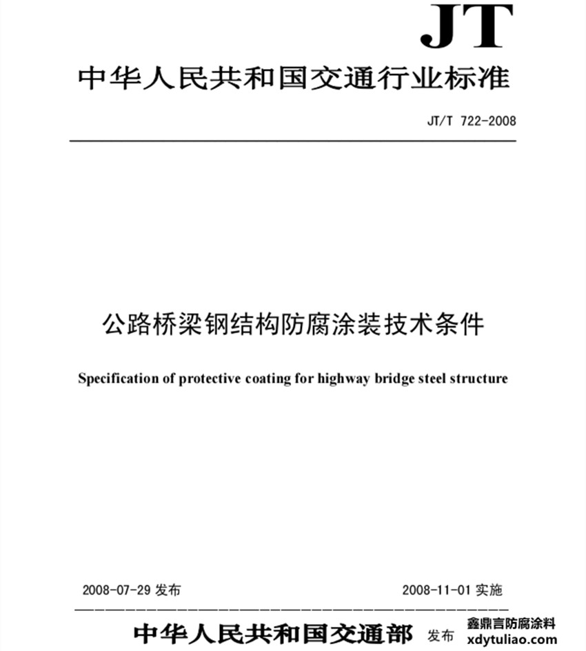 2、涂料的質量、性能和檢驗要求,應符合現行行業標準《建筑用鋼結構防腐涂料》JG/T 224的規定。同一涂層體系中各層涂料的材料性能應能匹配互補,并相互兼容結合良好。 3、防腐底涂料的選擇應符合下列規定: A、鋅、鋁和含鋅、鋁金屬層的鋼材,其底涂料應采用鋅黃類,不得采用紅丹類; B、在有機富鋅或無機富鋅底漆上,宜選用環氧云鐵或環氧鐵紅的涂料,不得采用醇酸涂料。 4、鋼材基層上防腐面涂料的選擇應符合下列規定: A、用于酸性介質環境時,宜選用聚氨酯漆、環氧漆、丙烯酸聚氨酯漆、氯化橡膠漆、聚氯乙烯螢丹漆、高氯化聚乙烯漆;用于弱酸性介質環境時,可選用醇酸涂料。 B、用于堿性介質環境時,宜選用環氧樹脂涂料,也可選用本條第1款所列的其他涂料,但不得選用醇酸涂料。 C、用于室外環境時,可選用氟碳漆、聚硅氧烷面漆、脂肪族聚氨酯面漆、丙烯酸聚氨酯漆、丙烯酸環氧漆、氯化橡膠漆、聚氯乙烯螢丹漆、高氯化聚乙烯漆和醇酸等涂料,不應選用環氧漆、環氧瀝青漆、聚氨酯瀝青漆和芳香族聚氨酯等涂料及過氯乙烯涂料、氯乙烯醋酸乙烯共聚涂料、聚苯乙烯涂料與瀝青涂料。 5、熱噴涂鋅、鋁或鋅鋁合金所用噴涂材料的質量要求應符合現行國家標準《熱噴涂 金屬和其他無機覆蓋層 鋅、鋁及其合金》GB/T 9793的規定。鋁合金可采用符合現行國家標準《變形鋁及鋁合金化學成分》GB/T 3190中的LF5,即含鎂5%的鋁合金。 6、金屬熱噴涂層表面所用的封閉涂層可采用磷化底涂料或雙組分環氧涂料、雙組分聚氨酯、雙組分環氧或雙組分聚氨酯等涂料。 7、所用鍍鋅板、鍍鋁鋅板、彩色涂層鋼板和耐候鋼的質量和材料性能要求應符合下列要求: A、鍍鋅板應采用符合現行國家標準《連續熱鍍鋅鋼板及鋼帶》GB/T 2518規定的S250或S350結構級鋼板;板面鍍層量應符合設計要求,無要求時,在微侵蝕、弱侵蝕或中等侵蝕環境中,其相應雙面鍍鋅量不應低于180g/m2、250g/m2或280g/m2; B、熱鍍鋁鋅合金基板應采用符合現行國家標準《連續熱鍍鋁鋅合金鍍層鋼板及鋼帶》GB/T 14978規定的S250或S350結構級鋼板;板面鍍層量應符合設計要求,無要求時,在微侵蝕、弱侵蝕或中等侵蝕環境中,其相應雙面鍍層重量不應低于100g/m2、120g/m2或150g/m2; C、壓型鋼板用彩色涂層鋼板的材質、性能與鍍鋅量等應符合現行國家標準《建筑用壓型鋼板》GB/T 12755的規定; D、耐候鋼應采用符合現行國家標準《耐候結構鋼》GB/T 4171規定的焊接結構用耐候鋼。 鋼結構防腐蝕涂裝術語(CECS 343:2013) 鋼結構防腐蝕涂裝術語(CECS 343:2013)是鑫鼎言防腐涂料摘自CECS 343:2013《鋼結構防腐蝕涂裝技術規程》2術語。大家可以放心參考。腐蝕性分級、防護層使用年限、涂裝、鋼材表面銹蝕等級、鋼材表面除銹等級、噴射或拋射除銹、手工和動力工具除銹、涂料、涂層配套 時間:2018/1/16 防腐蝕涂裝工程設計一般規定(CECS 343:2013鋼結構防腐蝕涂裝技術規程) 防腐蝕涂裝工程設計一般規定(CECS 343:2013鋼結構防腐蝕涂裝技術規程)是鑫鼎言防腐涂料摘自CECS 343:2013《鋼結構防腐蝕涂裝技術規程》大家可以放心參考。 鋼結構的防腐蝕涂裝設計應遵循安全實用、經濟合理的原則,在設計文件中應列入防腐蝕涂裝的專項內容與技術要求 時間:2018/1/14 常用防腐涂層配套(鋼結構防腐蝕涂裝技術規程CWCS 343:2013) 常用防腐涂層配套(鋼結構防腐蝕涂裝技術規程CWCS 343:2013)是鑫鼎言防腐涂料摘自:《CWCS 343:2013鋼結構防腐蝕涂裝技術規程》,大家可以放心參考。 時間:2018/1/14 建筑用鋼結構防腐涂料行業標準JG/T 224-2007 JG/T 224-2007建筑用鋼結構防腐涂料標準 中華人民共和國建工業行業標準 JG/T 224-2007 建筑用鋼結構防腐涂料Anticorrosive coatings for building steel structure 2007-08-21發布 2008-01-01實施 中華人民共和國建設部發布 本標準規定了建筑用鋼結構防腐涂料的分類、技術指標、試驗方法、檢驗規則及標志、包裝、運輸、 時間:2018/1/11 鋼結構橋梁漆化工行業標準HG/T 3656-1999 HG/T 3656-1999鋼結構橋梁漆 中華人民共和國化工行業標準 HG/T3656-1999 鋼結構橋梁漆Paints for steel structure bridge 1999-06-16發布 2000--06-01實施 國家石油和化學工業局 發布 本標準規定了鋼結構橋梁漆產品的要求、試驗方法、檢驗規則及標志、標簽、包裝、運輸、貯存。本標準適用于鋼結構橋梁漆用面漆、底漆、中間漆的通用技 時間:2018/1/10 鋼結構防腐漆涂裝配套方案 鋼結構防腐漆涂裝配套方案:介紹了火電廠、水電廠、工程機械、油罐、埋地管道、煤氣柜等常用的鋼結構防腐漆配套方案,配套方案針應用領域、涂裝部位等選用合適的油漆及相應的漆膜厚度。鋼結構用防腐涂料的首要前提是做底材處理,常用的處理方法是打磨噴砂,達到Sa2.5級標準,基材露出白鐵、無油污、無銹跡、無氧化層,只有這樣的底材才能夠確保涂裝質量的優異。 時間:2018/1/1 鋼結構氟碳漆怎樣配套省錢又能夠達到要求? 鋼結構氟碳漆怎樣配套省錢又能夠達到要求? 鋼結構上表面做氟碳漆,怎樣既能夠省錢,又能夠保證使用壽命,要在8-20年內外功、顏色、光澤能夠很好保持,當然不能生銹。氟碳漆十大品牌品牌-鑫鼎言氟碳漆為您提供以下建議: 配套方案1:8-10年的防腐期限;配套方案2:10-15年的防腐期限;配套方案3:15-20年的防腐期限。 時間:2017/12/31 JT/T 722-2008公路橋梁鋼結構防腐涂裝技術條件 JT/T 7