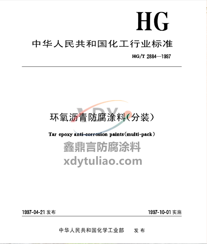 環(huán)氧瀝青防腐涂料(分裝)標準HG/T2884-1997:本標準規(guī)定了環(huán)氧瀝青防腐涂料(分裝)產品的要求、試驗方法及標志、標簽、包裝。本標準適用于以環(huán)氧樹脂、煤焦瀝青為漆基,加入顏料、體質顏料、溶劑、助劑及固化劑而制成的雙組份環(huán)氧瀝青漆底、面漆配套的防腐涂料(包括普通型和厚膜型兩類)。該涂料主要用于水下及地下鋼結構的重防腐涂裝。