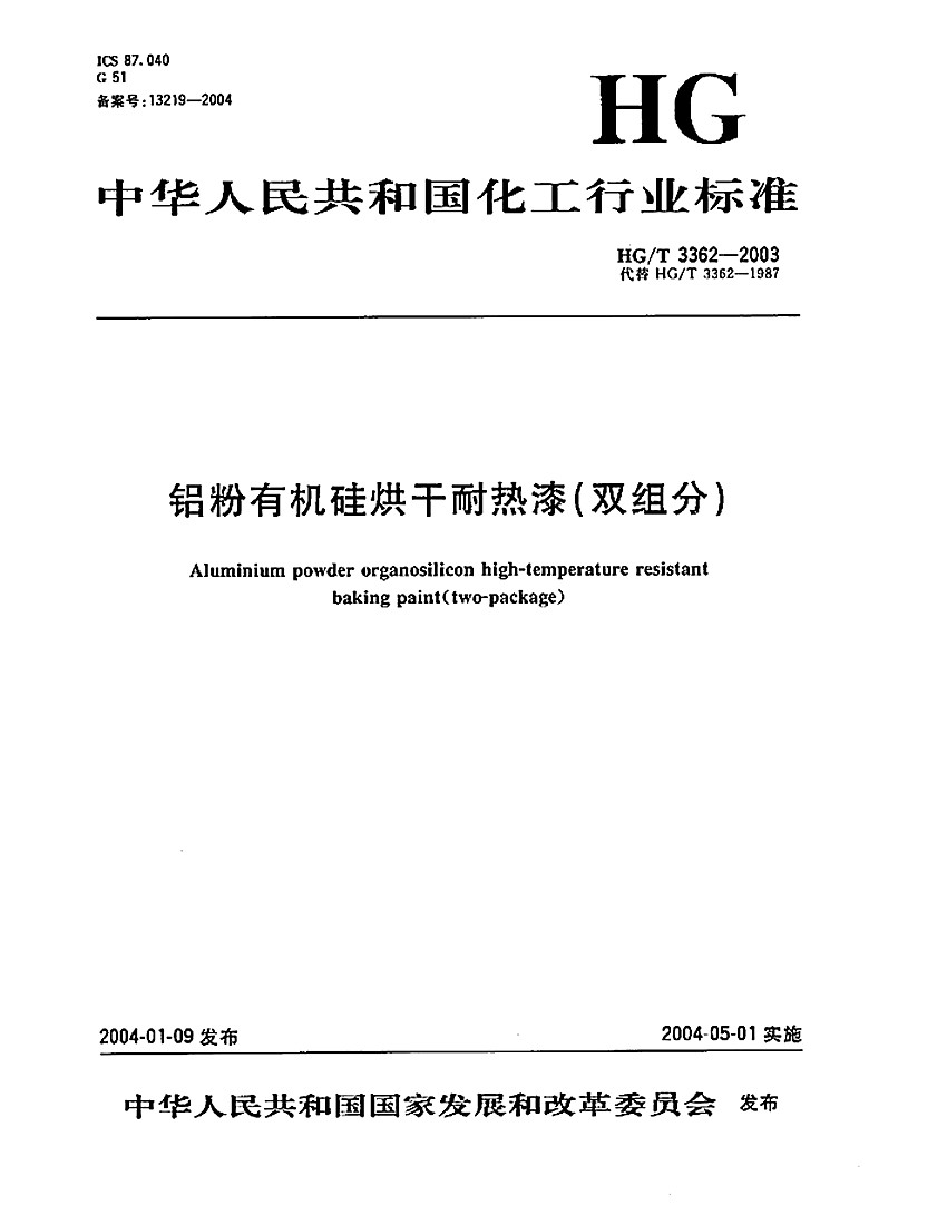 有機硅耐高溫漆標準HG/T3362-2003 ICS 87. 040 G 51 備案號:13219-2004 HG 中華人民共和國化工行業標準 HG/T 3362-2003代替 HG/T 3362-1987 鋁粉有機硅烘干耐熱漆(雙組分) Aluminium powder organosilicon high-temperature resistant baking paint(two-