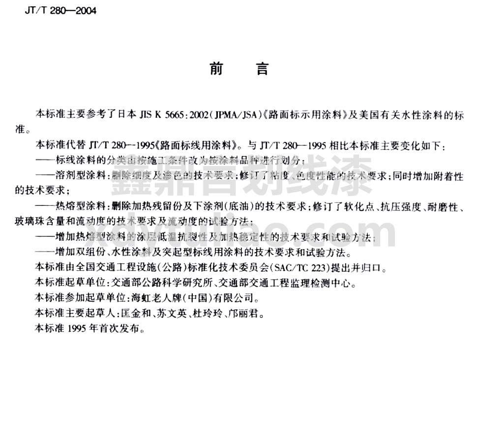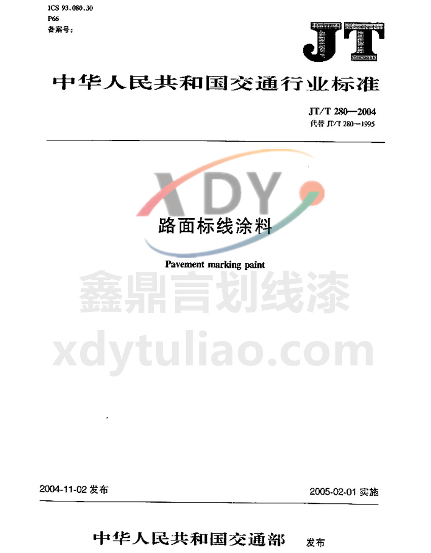 JT/T 280-2004路面標(biāo)線涂料標(biāo)準(zhǔn)是小編照搬JT/T 280-2004《路面標(biāo)線涂料》紙質(zhì)版內(nèi)容,大家可以放心參考。更多防腐涂料執(zhí)行國(guó)家和行業(yè)標(biāo)準(zhǔn)等防腐涂料相關(guān)信息可以參與網(wǎng)站:www.derdoor.com