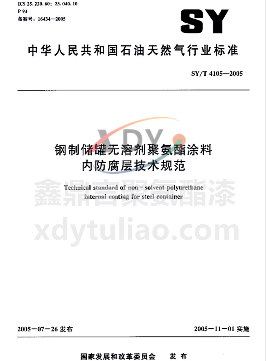 鋼制儲罐無溶劑聚氨酯涂料內防腐層技術規范標準SY/T 4105-2005