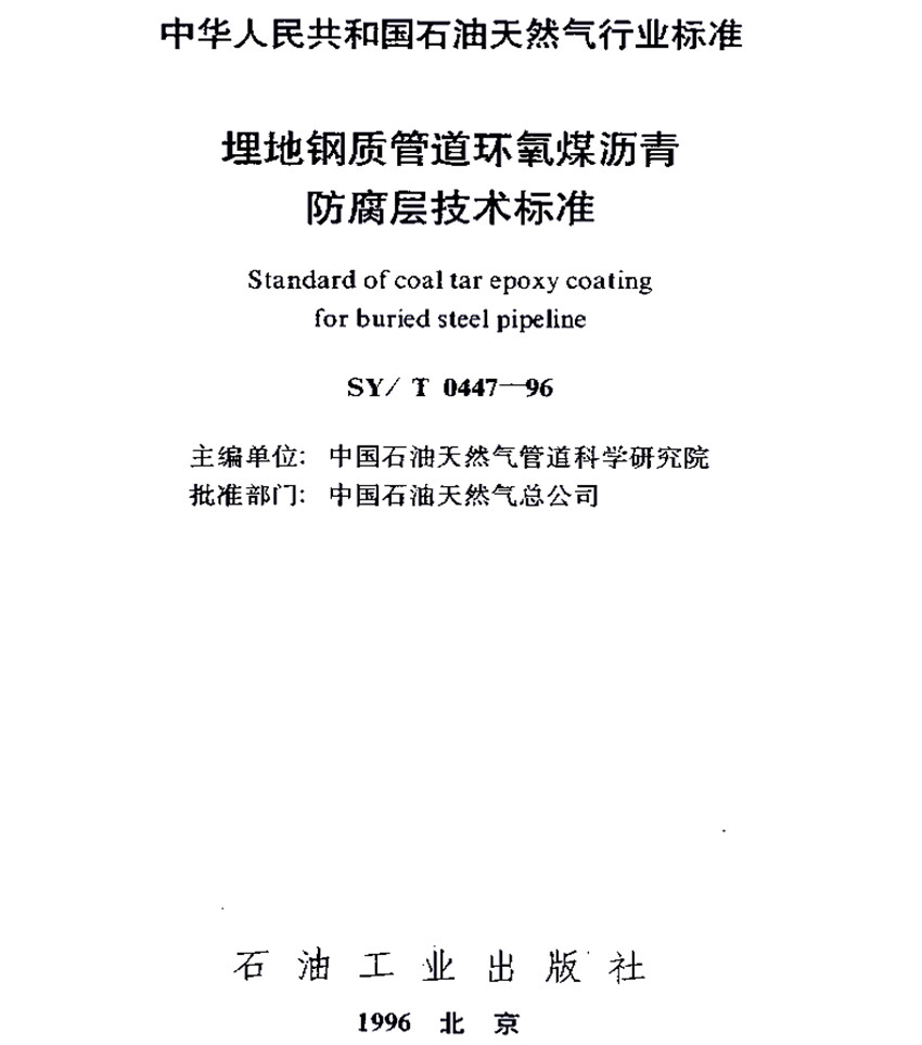 SY/T 0447-96埋地鋼質管道環氧煤瀝青防腐層施工技術要求標準是防腐涂料小編復制SY/T 0447-96《埋地鋼質管道環氧煤瀝青防腐層技術》電子版,可以放心參考。更多防腐涂料防腐涂裝執行的國家標準和行業標準,可以查閱博凱防腐涂料網站。